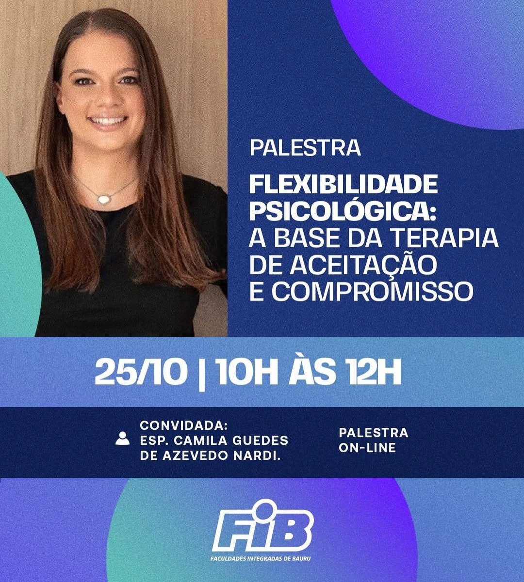 Dando continuidade às comemorações dos 10 anos do curso de Psicologia das Faculdades Integradas de Bauru (FIB) será realizada neste sábado (25), das 10h às 12h, a palestra "Flexibilidade Psicológica: a base da Terapia de Aceitação e Compromisso (ACT)", com a especialista Camila Guedes de Azevedo Nardi.