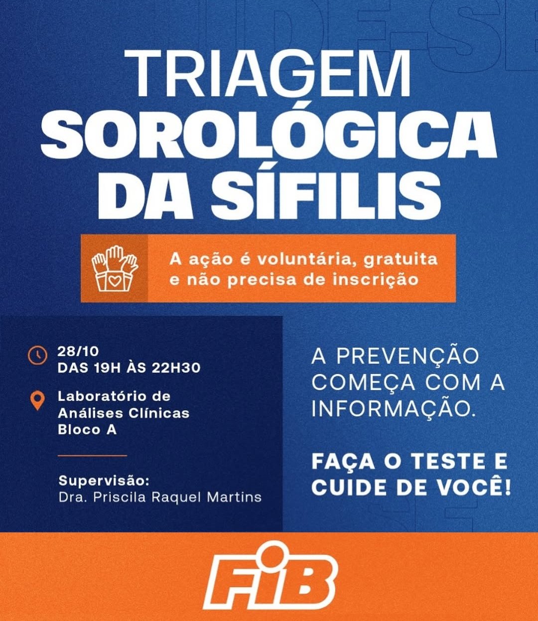 "Todos os interessados, desde alunos e servidores à comunidade externa, estão convidados a participar. A recomendação é chegar durante o horário previsto, portando documento de identidade ou algum comprovante. O laboratório estará devidamente sinalizado no bloco A da FIB, e a equipe de Biomedicina prestará esclarecimentos sobre a sífilis, a importância do teste e as medidas de prevenção", destaca a Dra. Ana Paula Battochio, professora e coordenadora do Curso de Biomedicina da FIB.