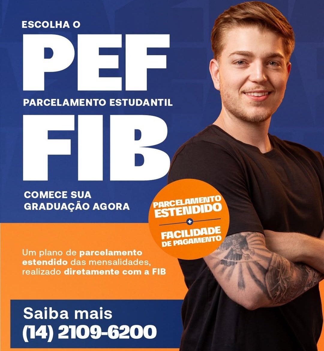 O Parcelamento Estudantil FIB é um benefício exclusivo para alunos da instituição e está disponível conforme análise e regulamentação interna. Para mais informações sobre o PEF, os interessados podem entrar em contato pelo telefone - e whatsapp - (14) 2109-6200.