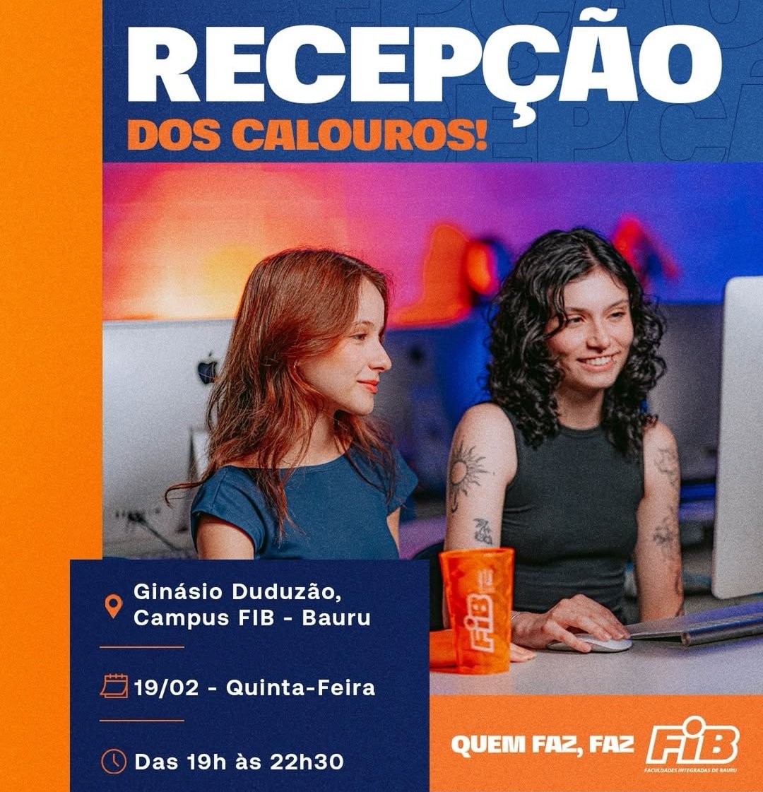 As Faculdades Integradas de Bauru (FIB) promovem nesta quinta-feira (19), a tradicional Recepção dos Calouros, evento que marca oficialmente o início da trajetória acadêmica dos novos estudantes da instituição. A programação será realizada no Ginásio Duduzão, no campus FIB, das 19h às 22h30.