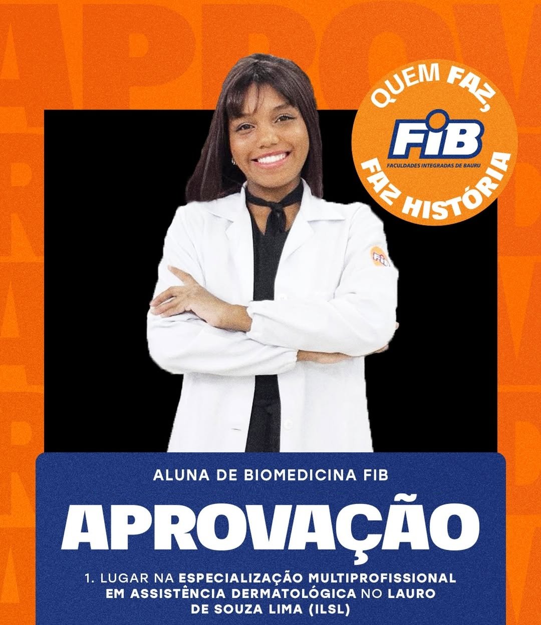 A excelência na formação acadêmica é refletida, mais uma vez, nos resultados alcançados pelos estudantes das Faculdades Integradas de Bauru (FIB). A aluna do curso de Biomedicina, Larissa Gabriele Alves Maria, conquistou o 1º lugar na Especialização Multiprofissional em Assistência Dermatológica no Instituto Lauro de Souza Lima (ILSL), referência nacional em pesquisa, ensino e atendimento na área dermatológica.