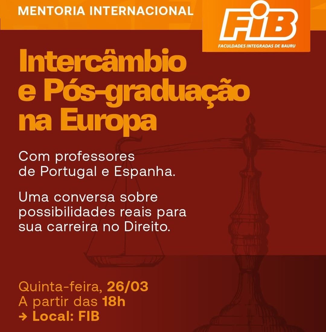 O curso de Direito das Faculdades Integradas de Bauru (FIB) realiza, nesta quinta-feira (26), às 18h, a Mentoria Internacional: Intercâmbio e Pós-graduação na Europa, um encontro voltado a estudantes e profissionais interessados em expandir suas carreiras jurídicas para o cenário internacional.
