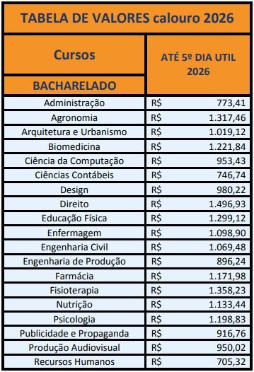 Na FIB, o aluno tem desconto de pontualidade pagando sua mensalidade até o 5º dia útil de cada mês. Confira na tabela os valores de desconto para o seu curso e em caso de dúvdas entre em contato com nossa equipe pelo fone/whats (14) 2109-6200.